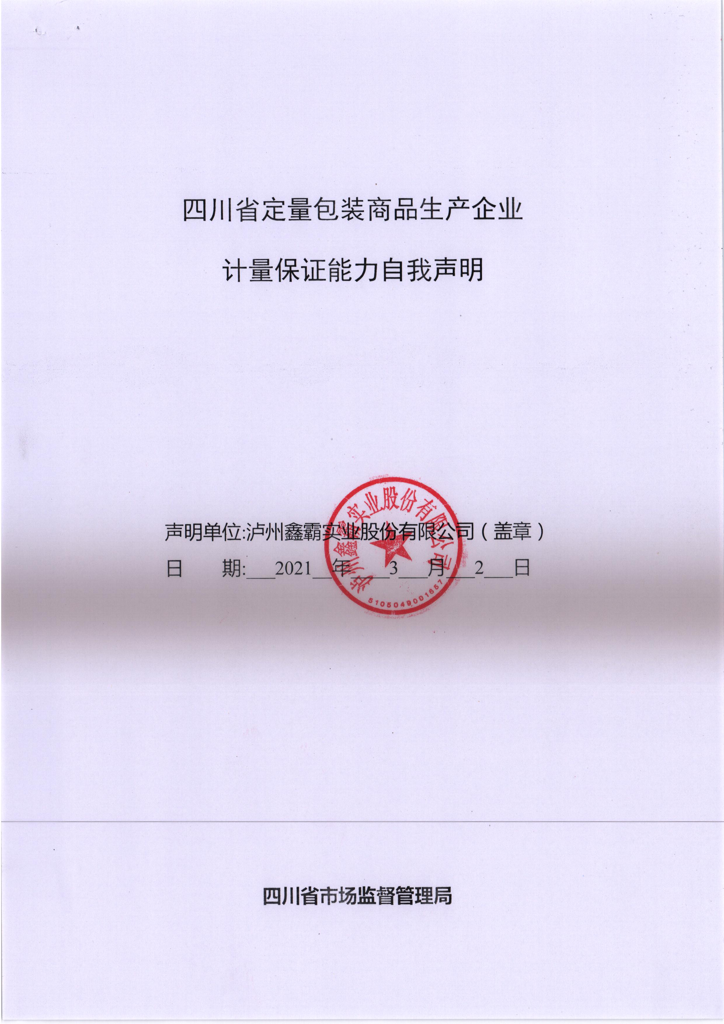 四川省定量包裝商品生產(chǎn)企業(yè)計量保證能力自我聲明